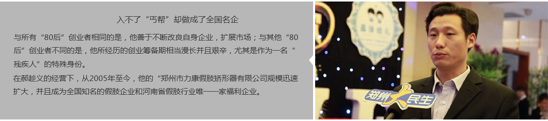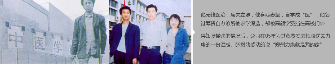 鄭州市力康假肢矯形器有限公司(簡稱力康),是一家專業(yè)從事假肢矯形器的設(shè)計、研發(fā)、制作及裝 配的專業(yè)機構(gòu)。成立于1992年是河南省唯一一家福利企業(yè)。力康下設(shè)業(yè)務(wù)部、技術(shù)部、住院部、康復 部、售后服務(wù)部,并配有現(xiàn)代化的裝配車間和功能齊全的訓練大廳,為殘疾朋友康復訓練提供了可靠 保障??偨?jīng)理穿戴假肢多年,有著豐富的臨床經(jīng)驗和親身體會;多年來,力康已為全國幾十萬名殘疾 朋友安裝上舒適、美觀、耐用的假肢和矯形器具,使他們更大限度地恢復了正常的工作和生活?!爱a(chǎn) 品即人品”的質(zhì)量理念、先進的技術(shù)、實惠的價格、完善的售后服務(wù)是力康取勝的法寶……